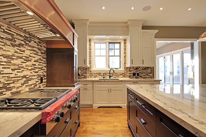 This project was a new custom home; we were contracted by the owner to stain and lacquer cabinets and railings, spray doors, baseboards, window frames, door casings, doors and painted cabinets. As well as painting ceilings and walls